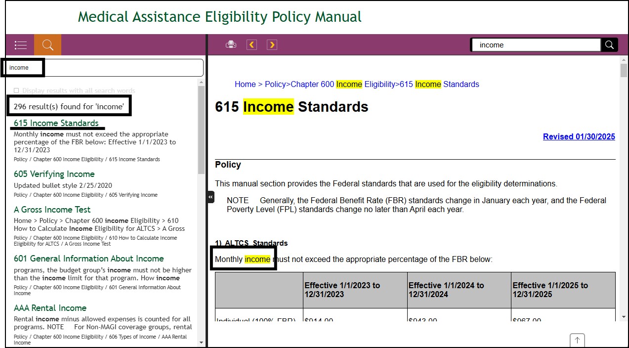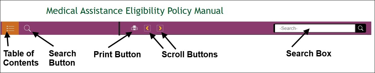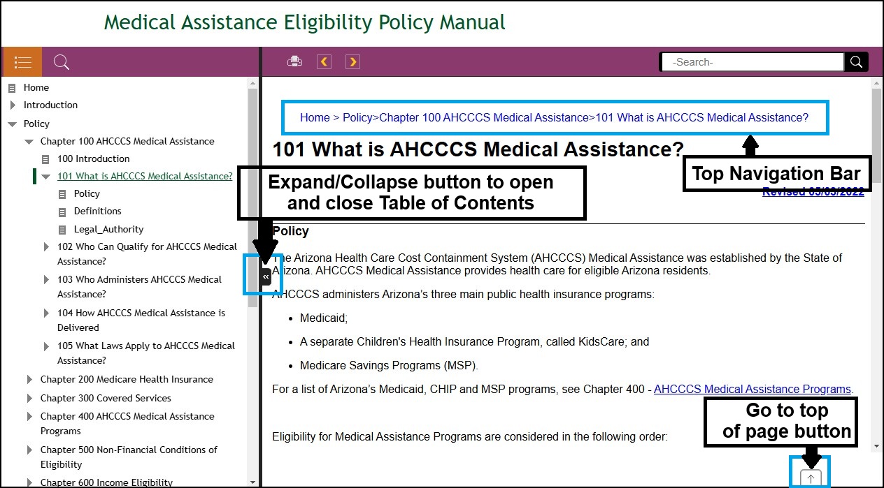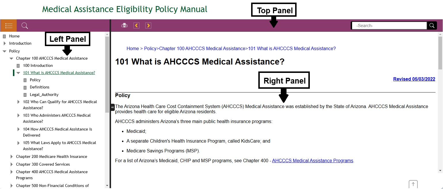 The window of the Arizona's Medical Assistance Eligibility Policy Manual is divided into three panels: top panel, left panel and right panel.